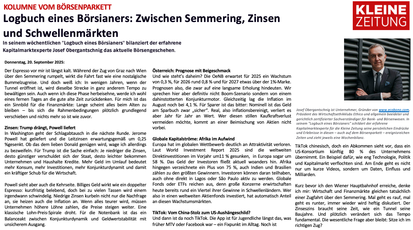 Auch zu Hause sind die Signale gemischt. Die OeNB erwartet 2025 nur 0,3 Prozent Wachstum, 2026 knapp 0,8 Prozent. Gleichzeitig lag die Inflation im August noch bei 4,1 Prozent. Am Sparbuch ist Geld nominell sicher, real verliert es Jahr für Jahr an Kaufkraft. Wer Wert erhalten will, muss diversifizieren – eine Beimischung von Aktien ist unumgänglich.